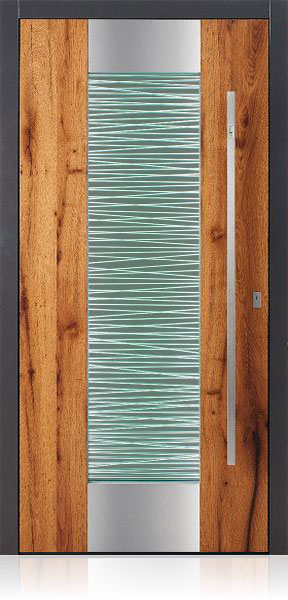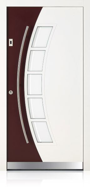 Beispielhaft dafür, dass eine Haustürfüllung im KOMPOtherm® Design immer wieder anders aussieht. Ein leichter Bogen, der nach links und rechts harmonisch ausläuft, prägt diese Modellreihe. Eine Gestaltungsvariante, die ihre Wirkung nicht verfehlt.